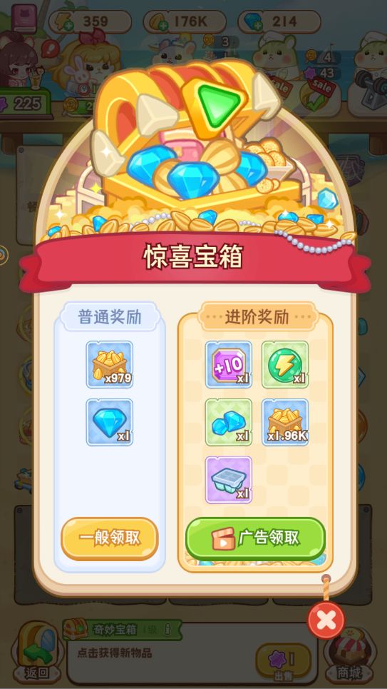 打开这些宝箱除了能获得钻石,瓜子等奖励以外,观看广告还能获得比如道具,生成器碎片,甚至是研究点数等实用物品,完全不花一分钱,建议触发宝箱的店长都可以通过观看广告获取完整奖励。