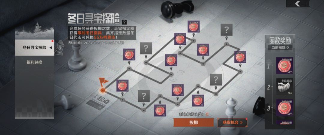 先锋可在活动界面选择获取次数,完成指定任务获取次数并投掷点数可获得冬日代币,获得一定数量的冬日货币可前往兑换柯恩币奖励!走完指定圈数还可获得【限时冬日面具】!