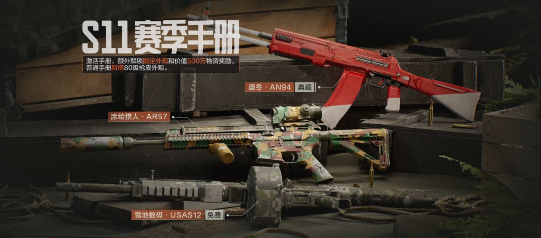 本次S11赛季手册贴合版本主题,推出雪地系列主题奖励,其中在普通赛季手册中新增枪械涂装【雪地数码·USAS12】,达到手册等级80级即可免费领取!