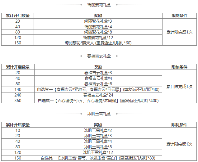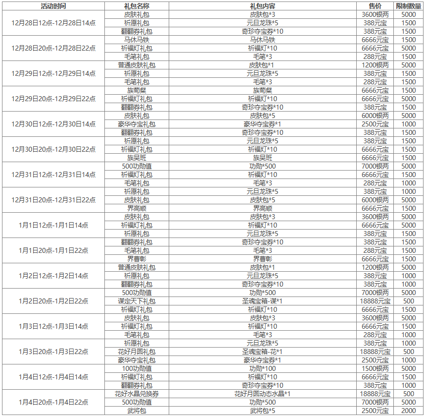 活动时间:2024-12-28 00:15:00~2025-1-4 24:00:00此次商城上架活动礼盒,均不可赠送和使用抵价券。活动礼盒打开后,部分重复道具返还孔明灯/夺宝重置券,具体详情见礼盒概率。