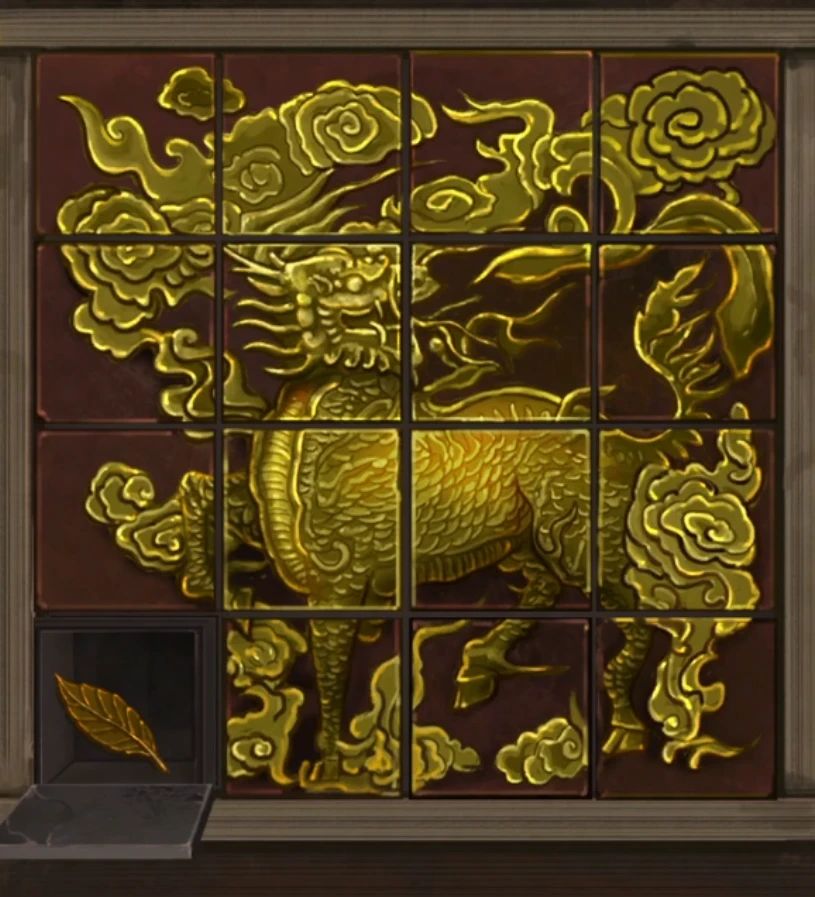 不多说了直接上攻略,有指引的就不说了,开门后直接开始调查,证明桌子后面可以玩个旋转拼图,最简单的拼图我喜欢~转一转到如上图,完成后左下角拿到一片铜叶子。在左边写着肃静的牌子下面可以拿到一个火折子,地毯需要用水,左转查看一下需要给小王八找点吃的,所以我们需要能装水的容器。