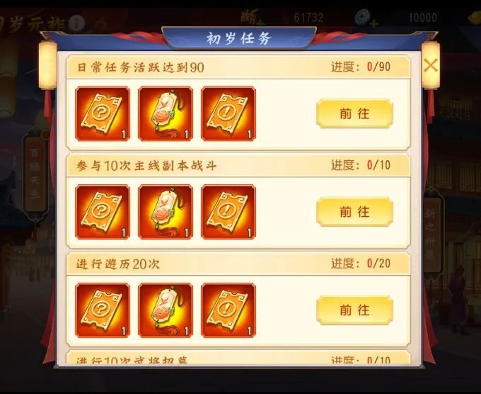 【初岁任务】 1、完成任务即可获得奖励,每日4点刷新请及时领取。