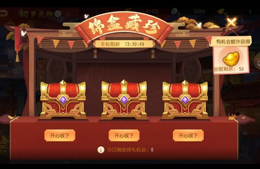 1、锦盒藏珍每日会提供3个装有不同奖励的宝箱,每日4点刷新。