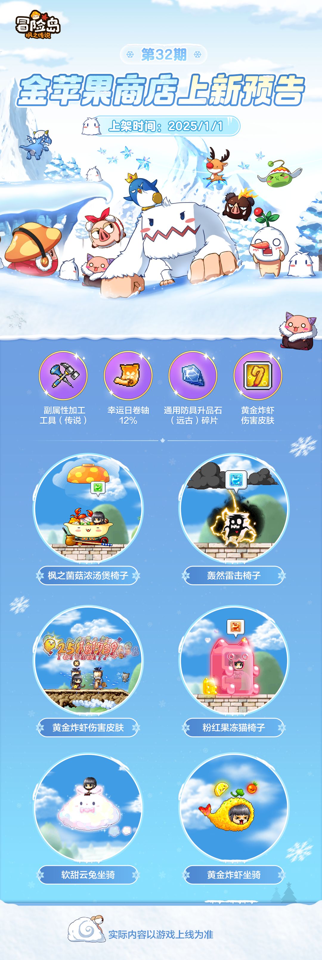 本期带来副属性加工工具(传说)、幸运日卷轴12%、通用防具升品石(远古)碎片等珍稀道具!同期还有枫之菌菇浓汤煲椅子、轰然雷击椅子等超多新品外观道具上新,冒险家们记得前往游戏内挑选喵~