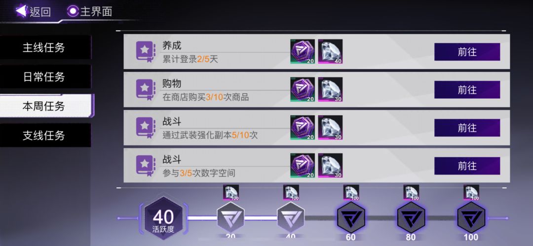 3.日常任务,周常任务记得做完,提示不是很明显,主页左下角,然后周常的商店买东西,买抽卡券也算,但必须要在商店里买,抽卡时直接买的不算,我也是刚注意。