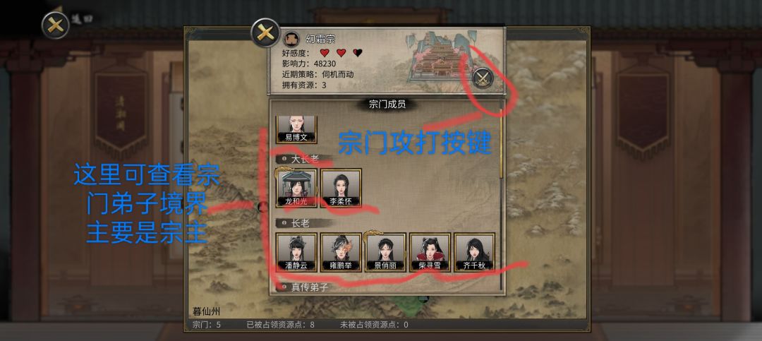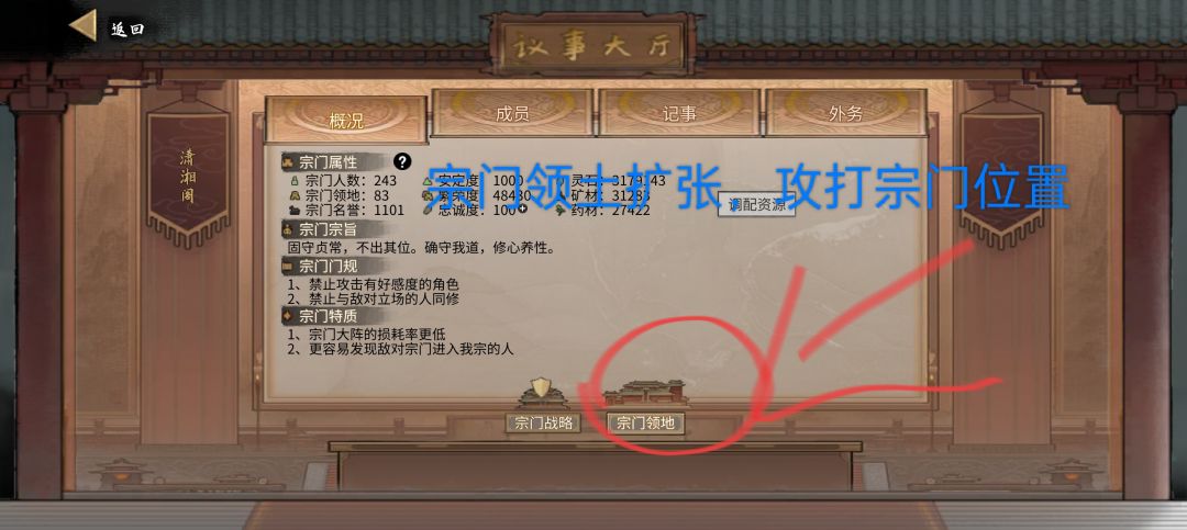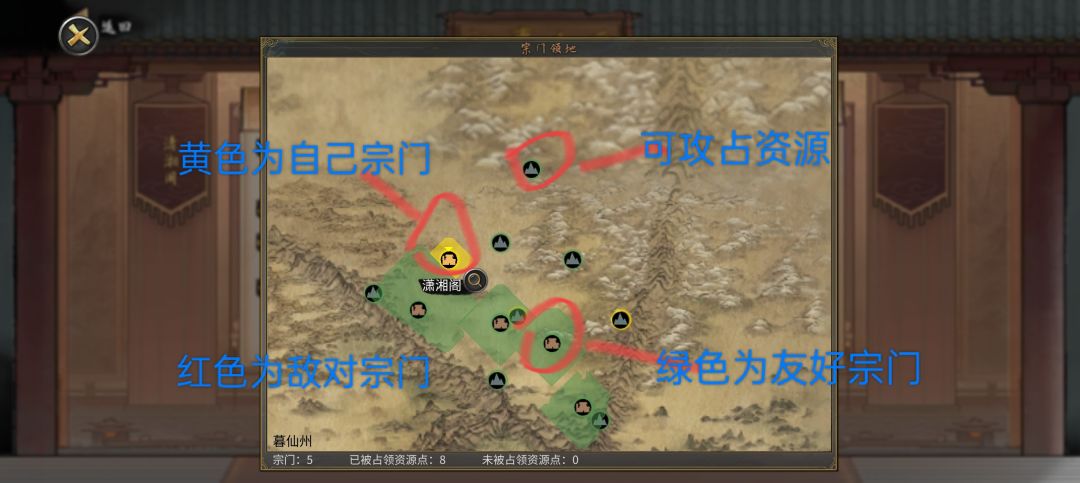 其次是宗门的领土扩张和攻打别的宗门占领资源的地点。它在宗门的议事大厅里,有一个宗门领地按钮,点击进入即可,宗门占领的资源越多,宗门战的优势越大,虽然最后都是打宗主。