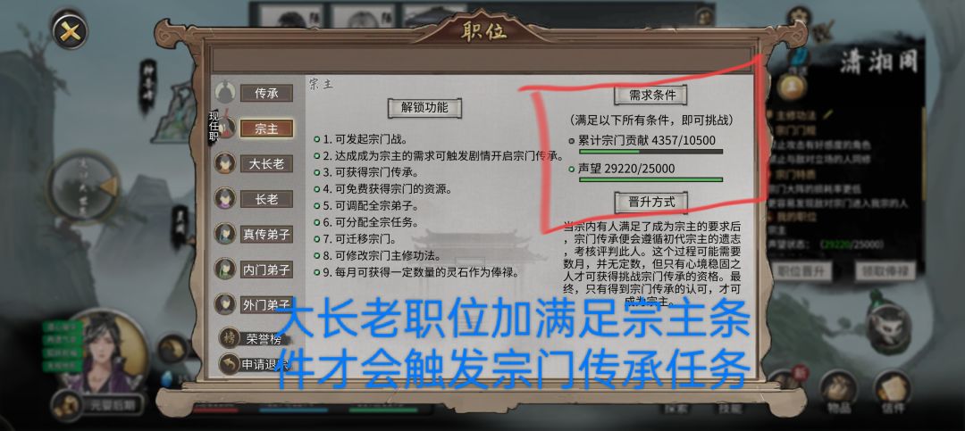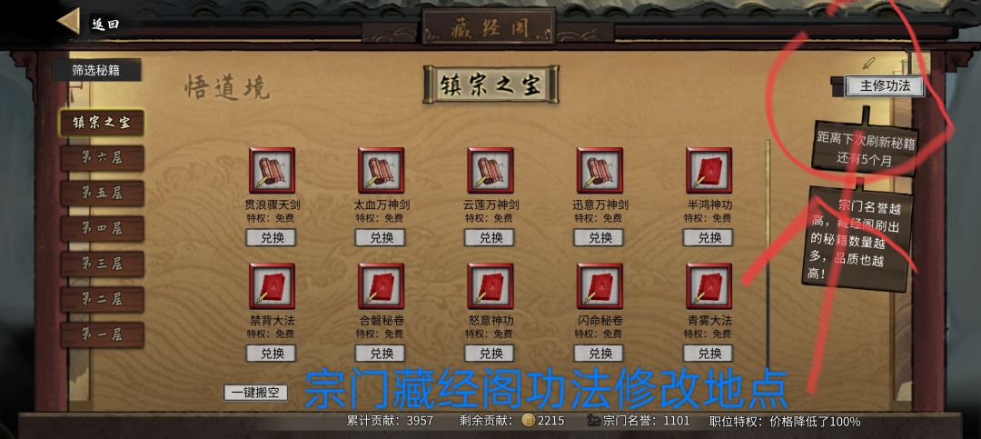 藏经阁不用我多说了吧,当宗主白嫖全红功法秘籍,功法秘籍的等级刷新与宗门所在地区有关,等级越高的宗门地区,刷出的功法品阶越高,每次要换新地区记得搬家。功法自己不用的可以送人和卖钱,反正是白嫖的。