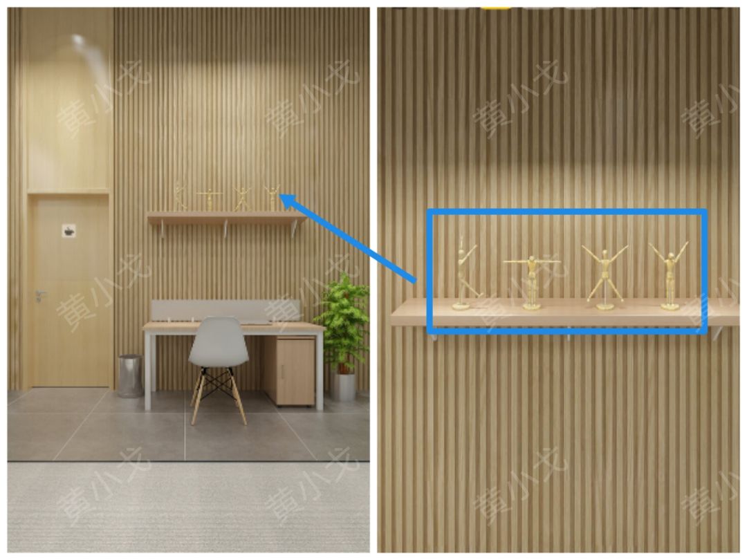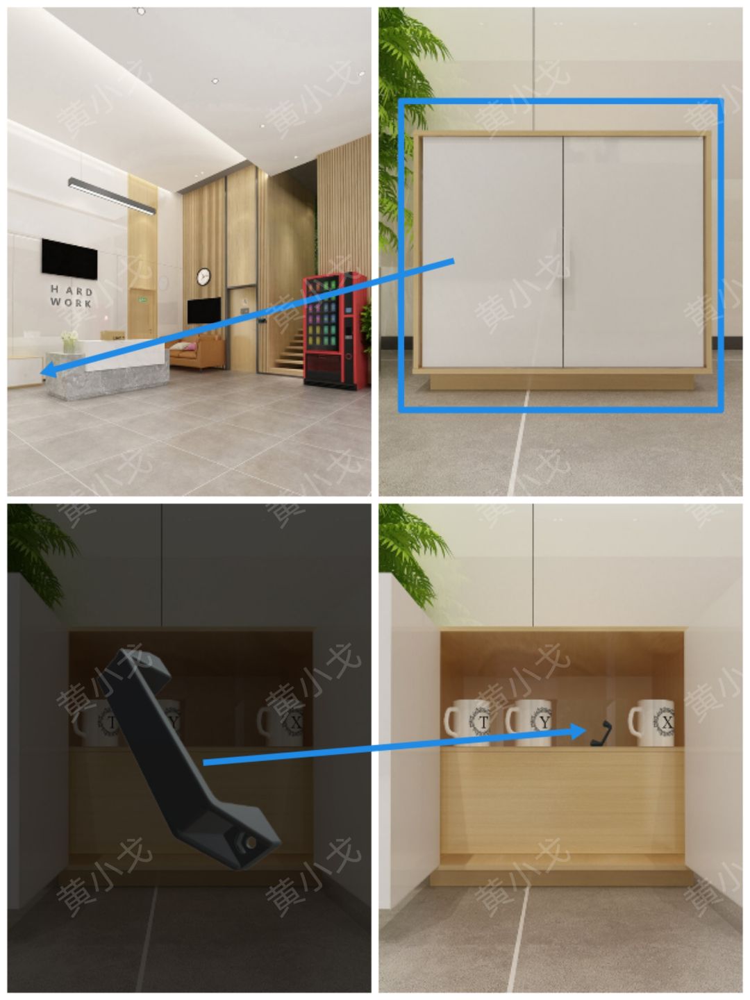 19.点击柜子,放入【杯子】;根据[员工办公室]场景木偶摆成的字母线索,调整印有对应字母的杯子的位置;打开下层柜子,获得【钞票】