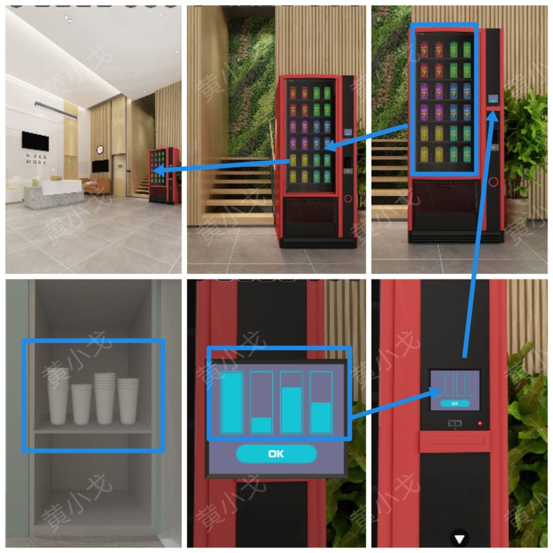 20.点击自动贩卖机钞票口上的密码锁,根据[员工办公室]场景饮水机柜子里的纸杯高度线索,调整密码锁