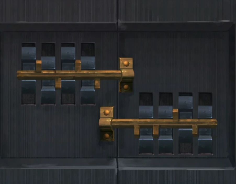 这里左边墙上贴着茶的名字,虽然很麻烦但是我们还是需要记下来的,这里尽量不要记的太简略,本来繁体字就容易出错,记好后查看一下下面的柜子,又是小机关,这个我们需要旋转中间的圆盘,让左右两根短棒都能收到圆盘中,其实看一下长度就很容易调整了,上面的最长的朝下,下面的最长的朝左就行了,如下图。