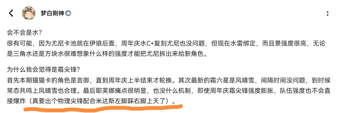 说下△:△现在的囧境是如果给烙痕和队友,强度直接爆炸,风晴雪一枪一管真不开玩笑。如果不给烙痕,很多角色队伍很难构筑。或许这次把队伍强度拉上去是为了让三角能登场吧。