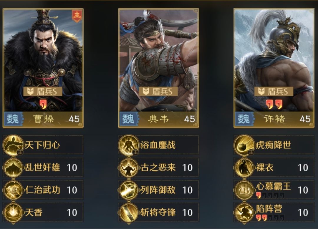 搭配思路:主要以典韦和许褚的被动反击技能为输出,然后曹操为其提供治疗、减伤和增伤效果,可以有效的提升队伍的整体续航,以及伤害的提升。其中曹操和典韦还能联动,让典韦获得曹操的百分比武力,施加给自身。典韦携带斩将夺锋能施加重伤,又能联动许褚固有技能,触发其增伤效果。基本队伍间的联动非常的密切,从而使得队伍的强度和稳定性比较高。