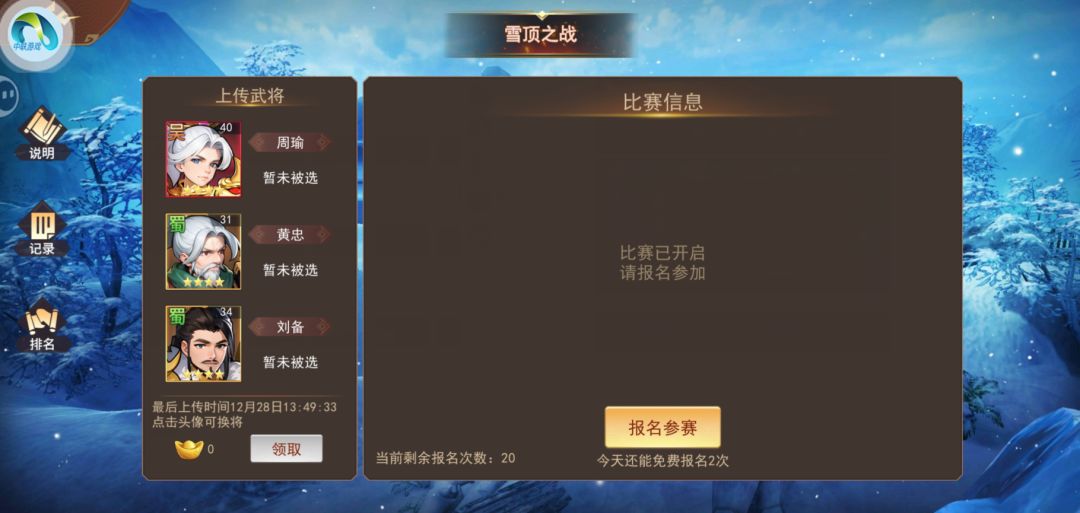 1、雪顶之战为周常玩法,开启当天00:00即可上传武将到参赛者选将使用的武将库,开启当天8:00可以开始报名参赛。