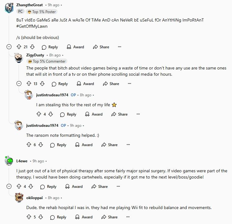 这件事在Reddit上引起网友们的热议,纷纷赞叹这种治疗方式。有人表示“那些总是抱怨玩电子游戏是在浪费时间、没有任何用处的人,就是会坐在电视机前或者在手机上看社交媒体软件的人。”