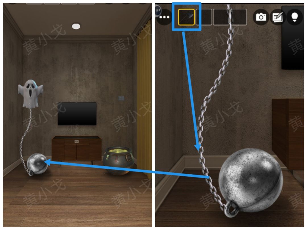 16.点击铁球,用【斧头】砍断铁链,幽灵飘进电视
