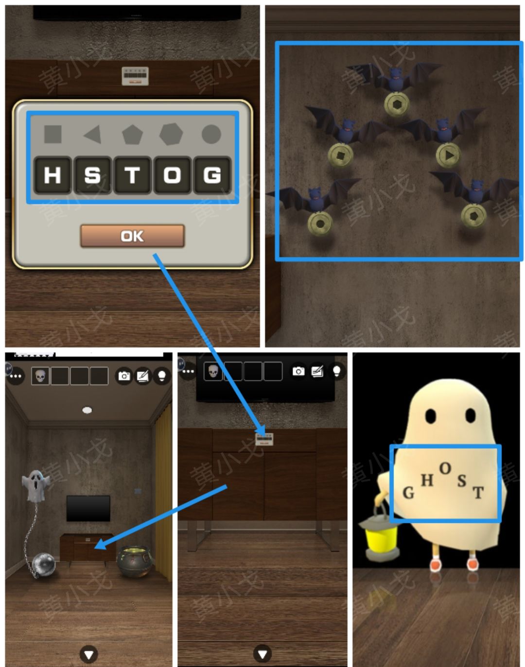 🔶[门]场景衣服上的字母:GHOST,[小鬼]场景蝙蝠抓着的铜钱形状:圆、正方形、六边形、三角形、五边形