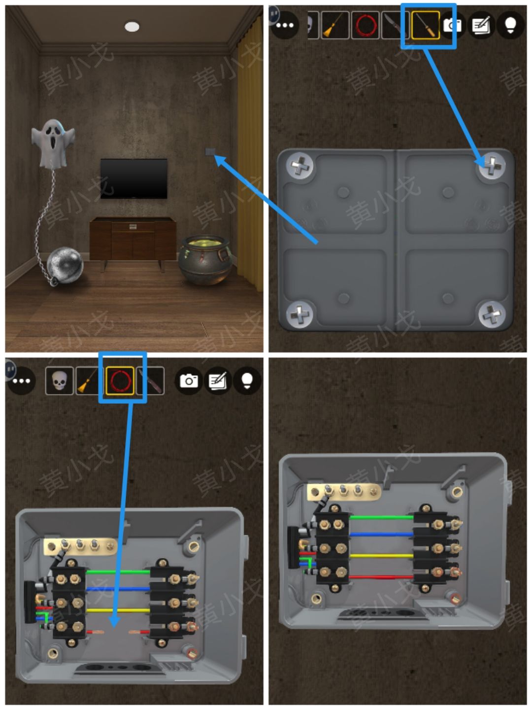 5.点击墙上的电箱,用【螺丝刀】拧开螺丝钉;打开电箱面板,接上【电线】