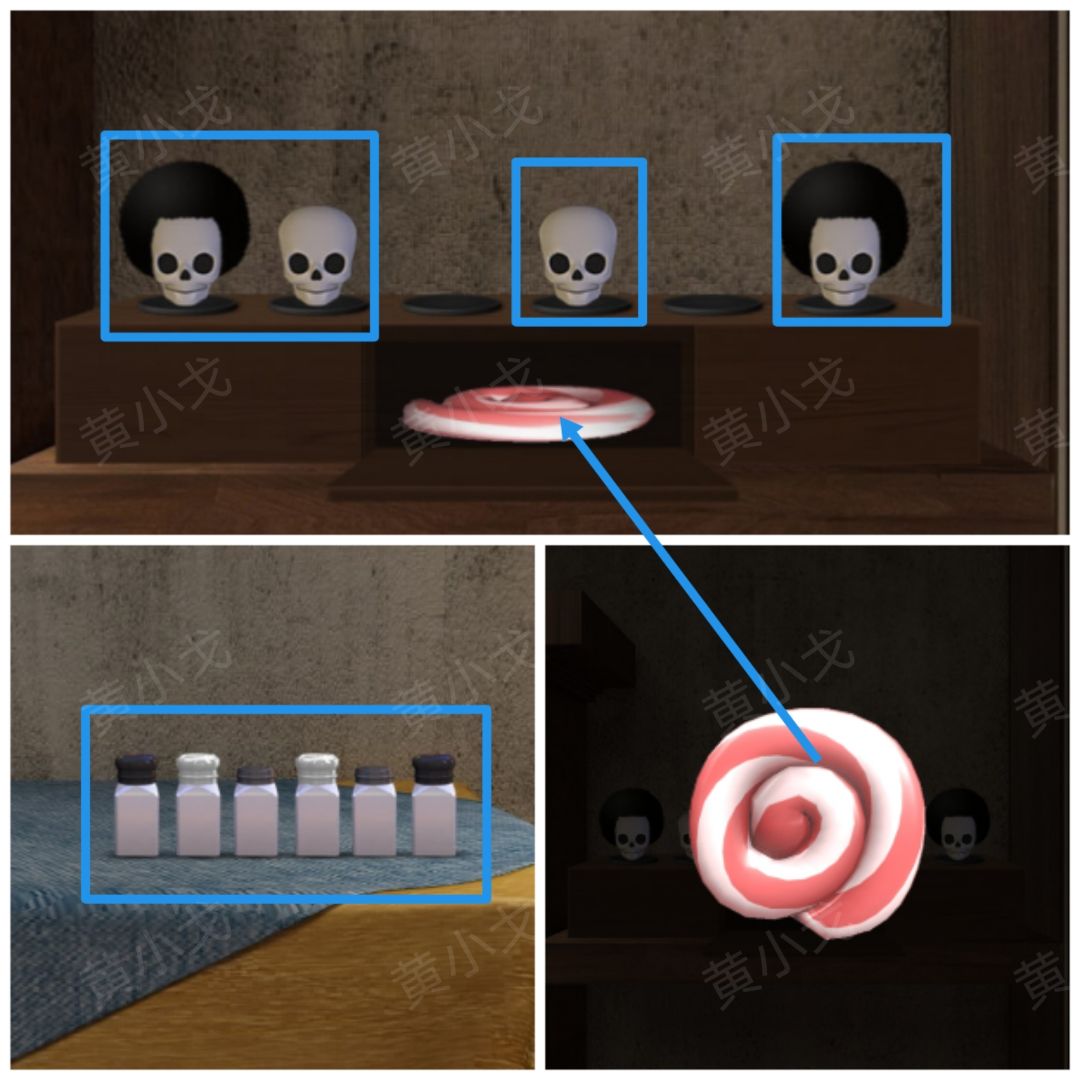 22.根据[小鬼]场景瓶口颜色顺序线索,正确摆放骷髅头的位置;打开暗格,获得【糖果】