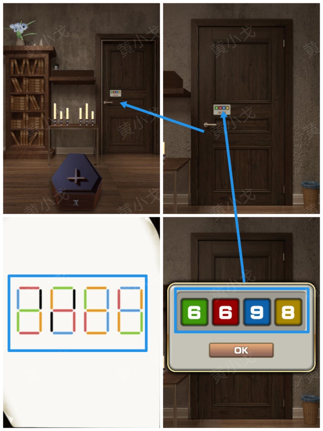 1.点击门上的密码锁,根据密码锁上的颜色提示,结合【纸条】上的线索,输入密码:6698;打开门