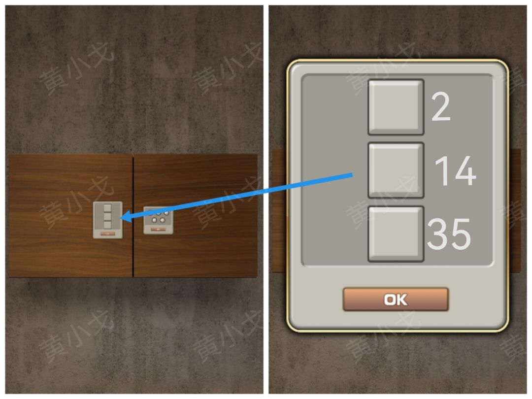 8.点击壁柜左侧柜门上的密码锁,根据[密室]场景幽灵亮起的位置线索,按顺序按下按钮