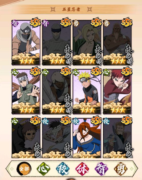 忍者从橙色五星级上来分,分为SSS,SS,S级。SSS是比较稀有的忍者,强度也是最高的。而紫色四星的忍者主要是用来作为养成材料用,因此没有什么培养价值,因此在阵容搭配上,首选SSS级别的忍者进行养成搭配从属性来分,分为智,勇,心,技,体,对应不同的忍者属性分类,在阵容搭配的时候,适当每个属性进行合理搭配,有时候能起到不错的作用。