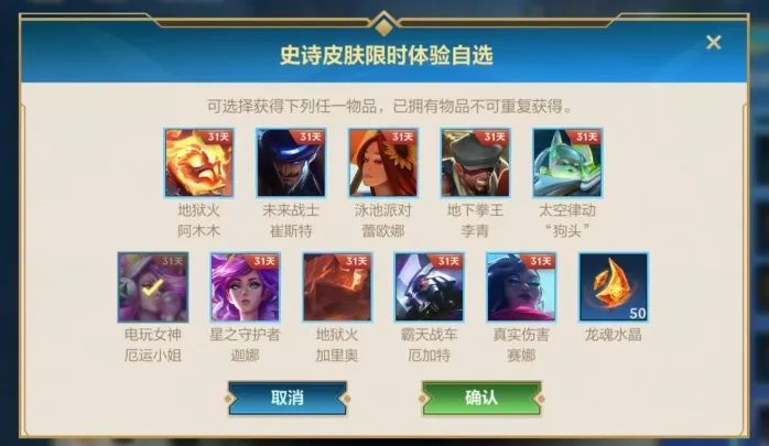 与此同时,到今日累计签到28天的召唤师,还可领取史诗皮肤限时体验自选奖励,多款史诗皮肤任你挑选,免费皮肤体验不容错过!忘记签到的召唤师还可通过完成任务获取补签卡进行补签~