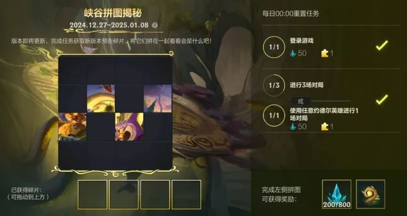 6.0版本“这就是约德尔!”即将登场!截止至2025年1月8日,召唤师参与活动获取新版本预告碎片,完成拼图即可领取击败印记-年轮秘密、蓝色晶石*800和龙魂水晶*50好礼~