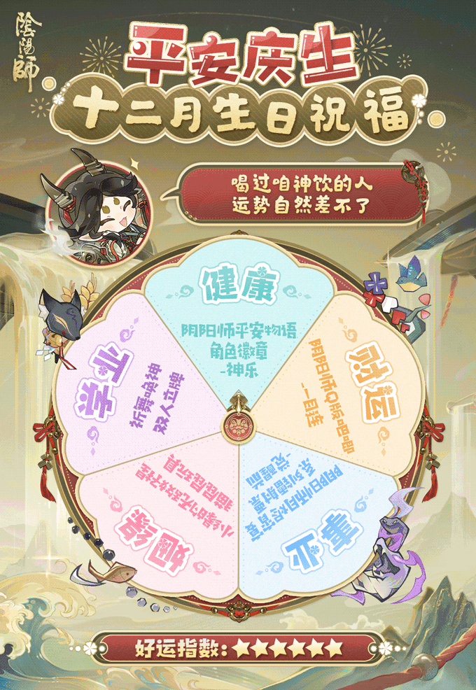 欢庆之声四起,鸟雀共鸣欢歌,花瓣随风轻舞,酒香飘满庭院。装饰着麦穗与椿花的蛋糕,香气扑鼻,令人陶醉。神酿星熊童子携美酒而来,与12月诞生的寿星们共聚一堂,为本月庆生的大人们送上最真挚的祝福!