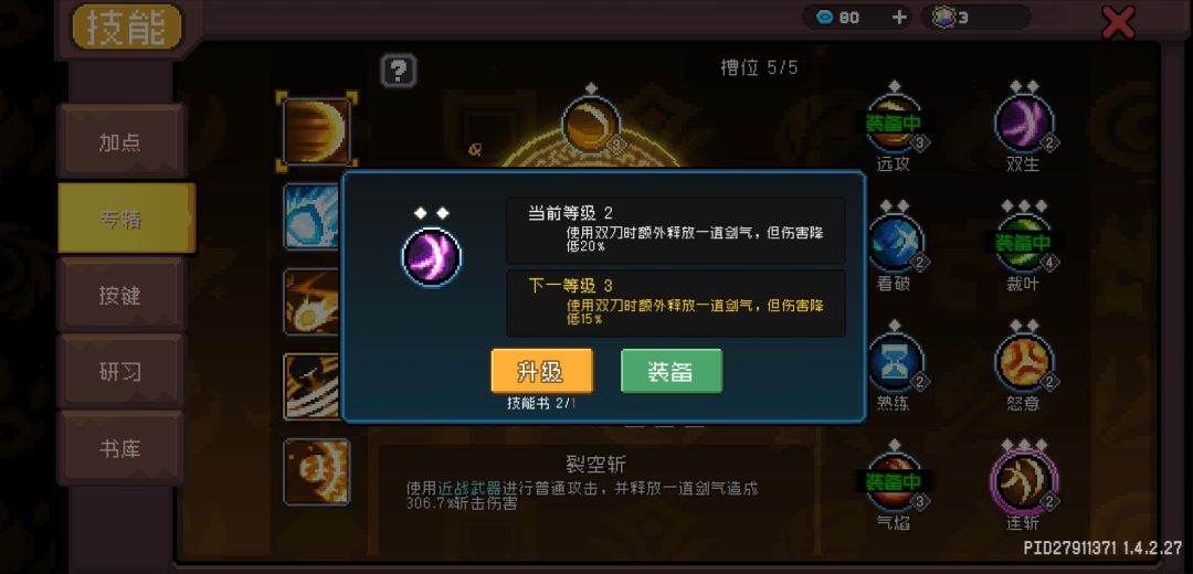 由于双生的缘故武器需要带双刀,可以多打一道剑气