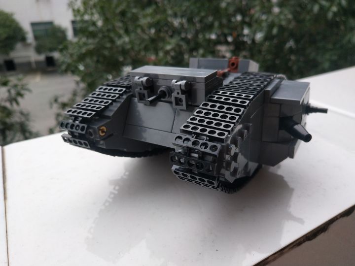 顾名思义,这台坦克拥有厚重的装甲,并且可以左右移动,主炮与副炮均在两侧,前端主炮可发射重型炮弹,但射击范围仅有前至侧面的45°(如上图),副炮为固定式速射炮,采用特制的穿甲弹。