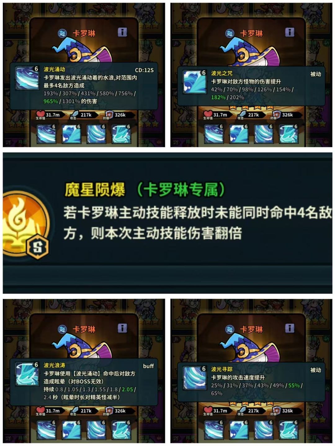 卡罗琳的专属技能魔星陨爆更是她的战斗绝技。若卡罗琳在释放主动技能时,未能同时命中4名敌方,那么本次主动技能的伤害将会翻倍。这一技能机制使得卡罗琳在战斗中即使没有完全命中所有目标,也能凭借强大的伤害输出让敌人感受到巨大的威胁,让敌人在她的水浪攻势下毫无还手之力,只能在波涛汹涌的攻击中逐渐败退。