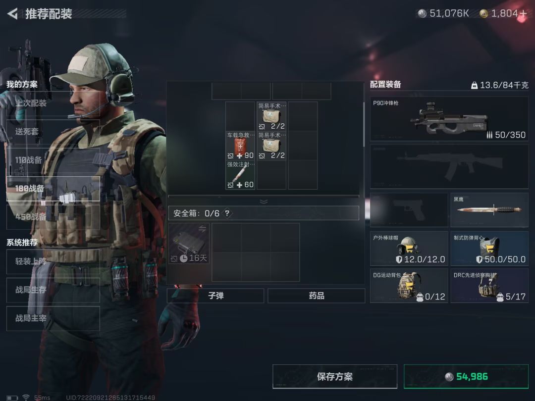 装备推荐:本攻略不卡战备。头推荐一级听力头,甲推荐三级最便宜的甲,背包推荐12格的DG运动背包,胸挂推荐17格的DRC先进侦查胸挂,枪推荐冲锋枪,喜欢哪个用哪个,凑够战备就行。药品看图,子弹用一级弹修脚。打不到脚用二级弹打身子。