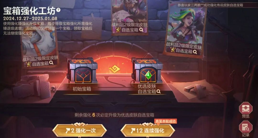 截止至1月8日,召唤师使用强化锤强化升级宝箱,最高可领取战利品2级限定皮肤自选宝箱好礼~