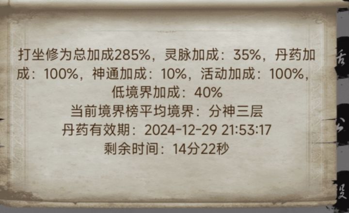 扯远了,关于修为获取,前几天主要靠打坐获得大量修为,氪佬可以买红色的修为丹药(每天三颗)
