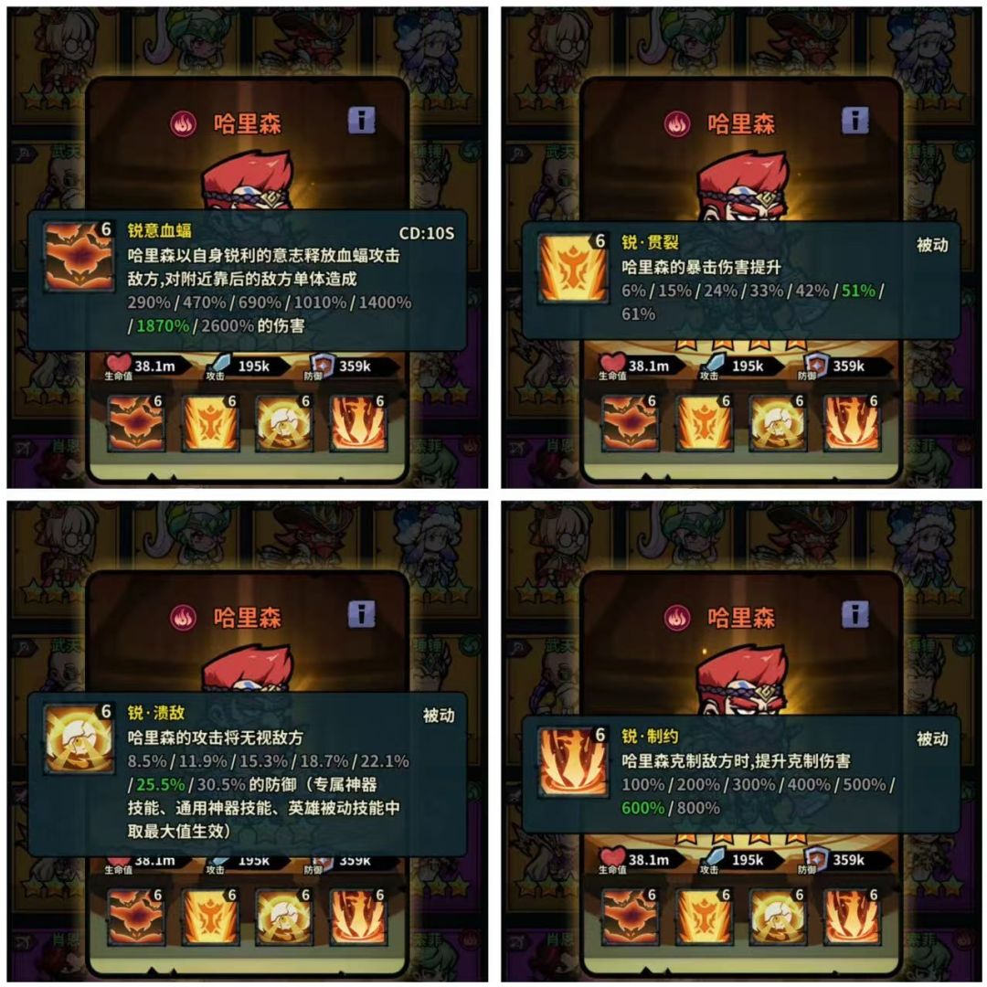 哈里森这个英雄局限性很大,或者说在某些特定场景才能发挥最大的作用,正所谓成也萧何 败也萧何,因为哈里森最实用的技能恰恰也是他局限的原因,并且为什么我会叫他狂战士,看名字就知道,他属于一个纯输出类的角色,个人在装备选择上肯定是无脑堆所有和输出相关的词条属性,看到无脑选就好了,,所以要想发挥他的最大输出要满足几个条件,首先要具备克制效果,哈里森属于火系,所以在实战风系列阵营可以发挥超过百分之一百的实力,其次在打副本中,要有足够扛的住的前排,不然就只有被秒杀的,命运。