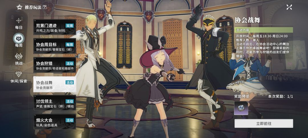 活动开启后,在协会活动中心的舞台上展示你的卓越舞姿吧!获得奖励的同时,还能为参与狩猎的战友们提供增益!