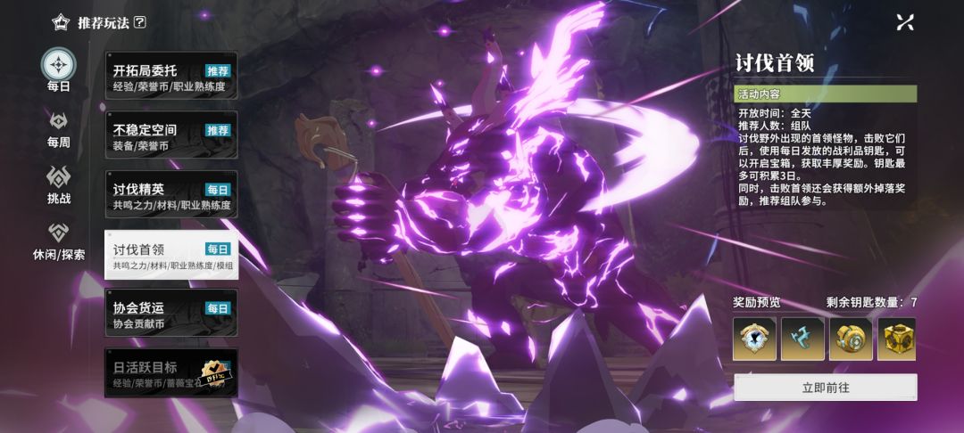 野外出现的首领怪物,击败它们后,使用每日发放的战利品钥匙,可以开启宝箱,获取丰厚奖励。钥匙最多可积累3日。