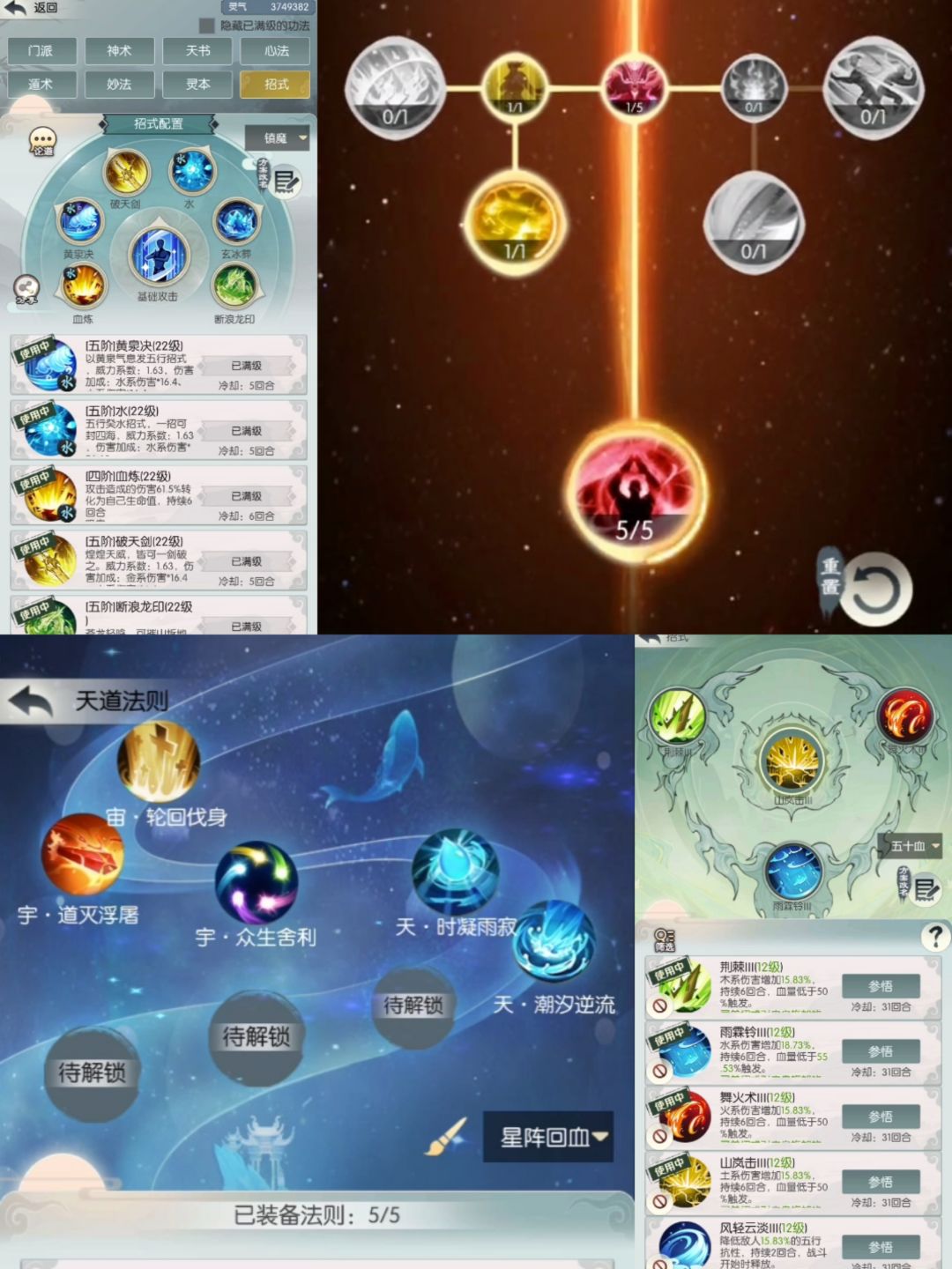 3、技能就是血炼+5 个五行输出,搭配剑左天赋的仙剑打点伤害。