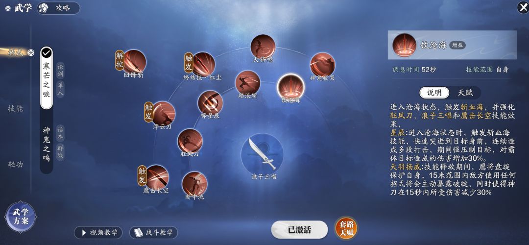 技能循环方面,开局大家通常会打一波爆发,这时候就可以使用上面说到的饮沧海开局,来强化神刀的其他技能,使其能够在开局压下更多的血量。