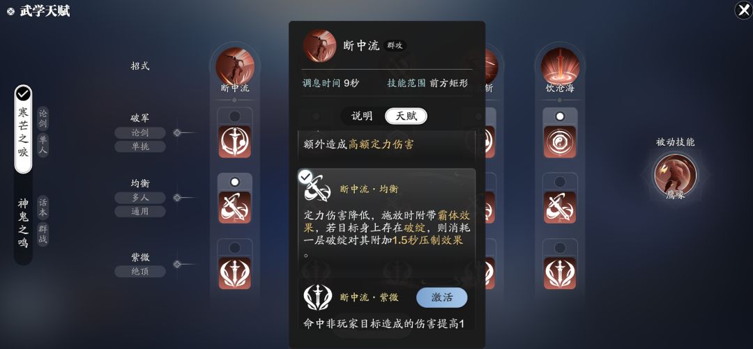 比如断中流·均衡,其效果为施放时附带霸体效果,若目标身上存在破绽,还会消耗一层破绽附加1.5秒压制效果,直接让神刀的论剑强度上了一个台阶。