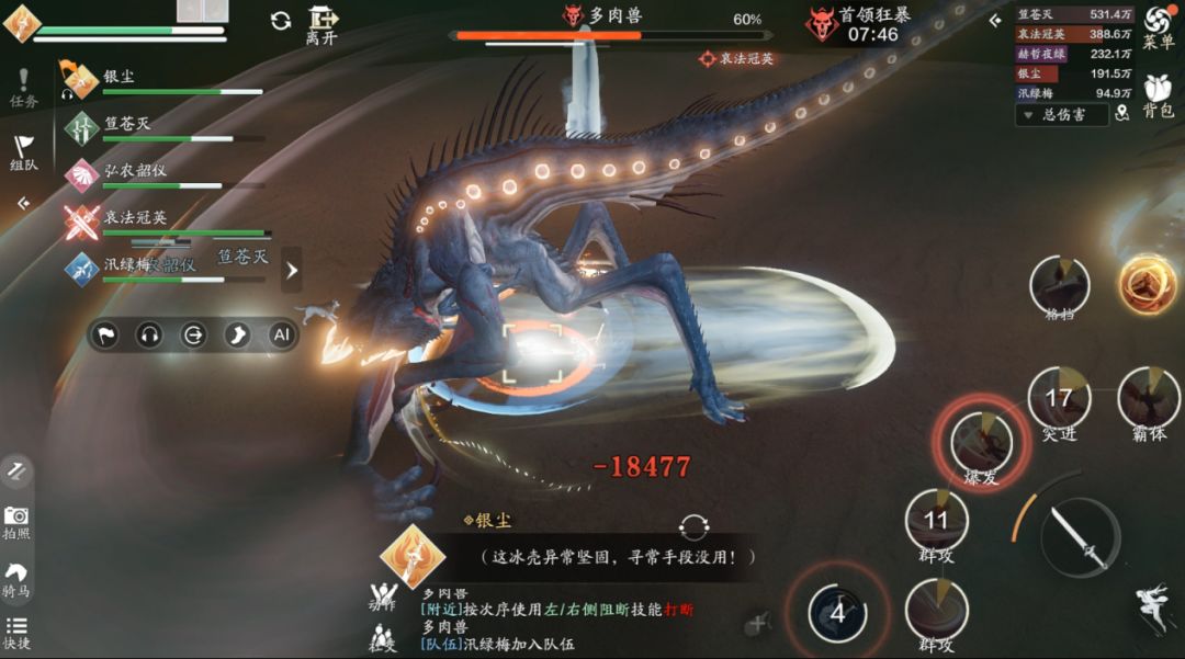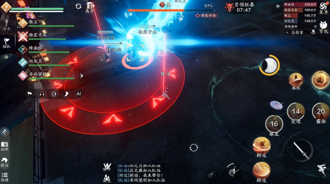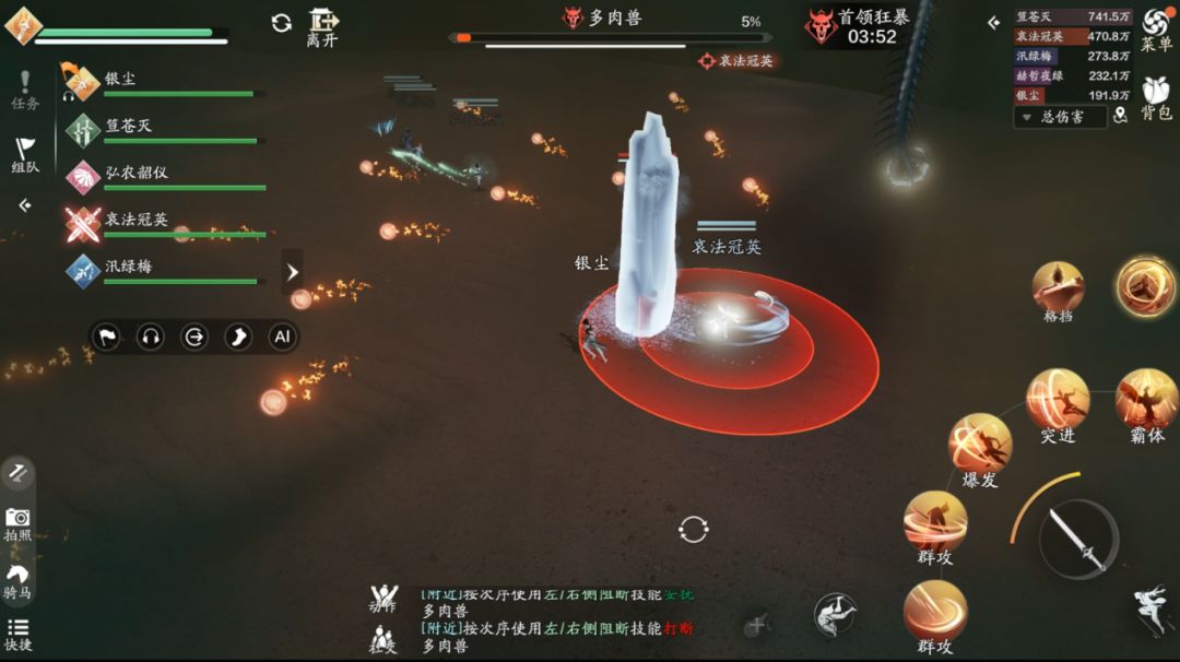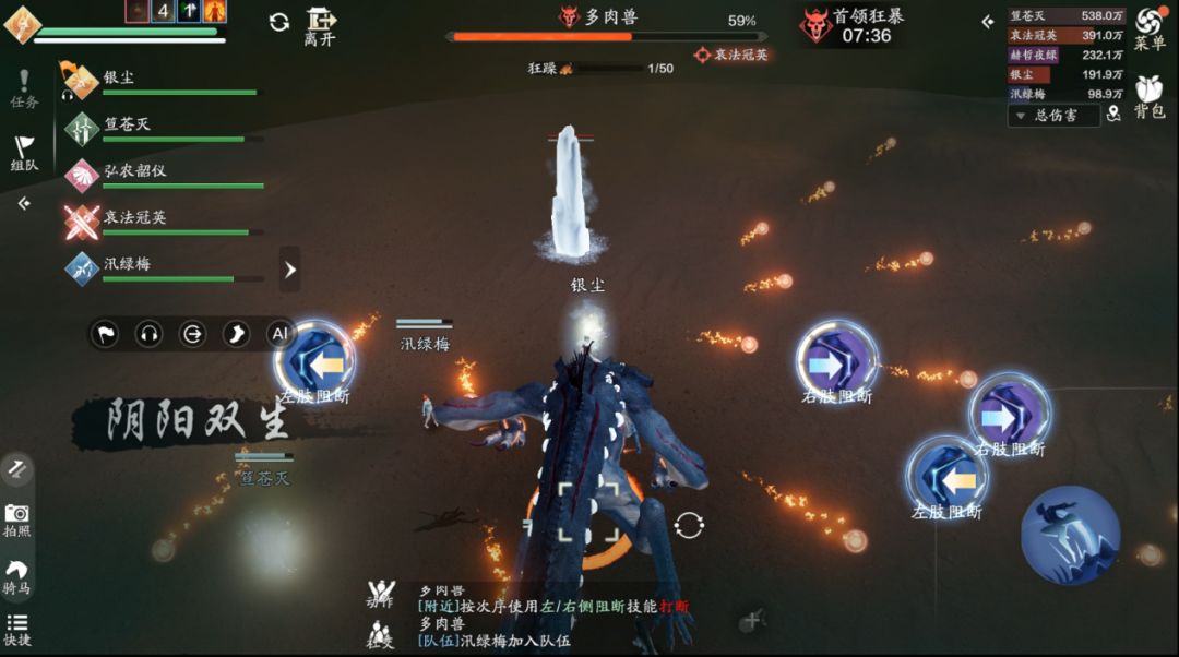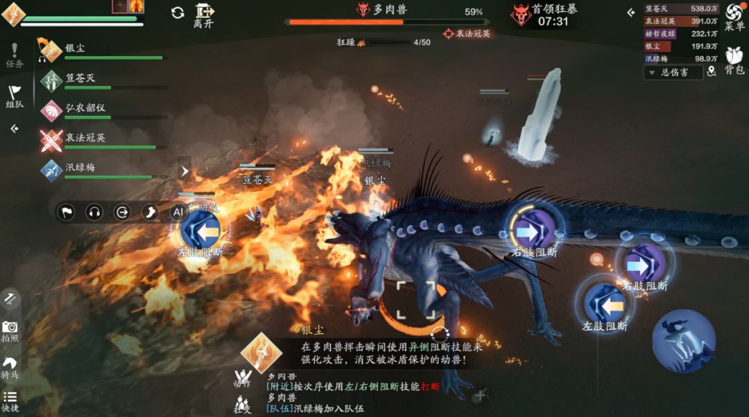 方向其实很简单,我们只需要观察首领的抬的是哪只手即可,在我们的视角中,首领抬的是右手,那么我们需要按左边的技能“左肢阻断”,如果首领抬的是右手,那么我们需要按右边的技能“右肢阻断”。这里一定要注意,输出跟治疗一定要远离技能的红圈,不然会受到巨额的伤害。如果首领在人群中释放范围技能,我们可以采用“同方向阻断”来取消它的技能,如果依旧使用“反方向阻断”就会造成“我痛击我队友”的名场面。