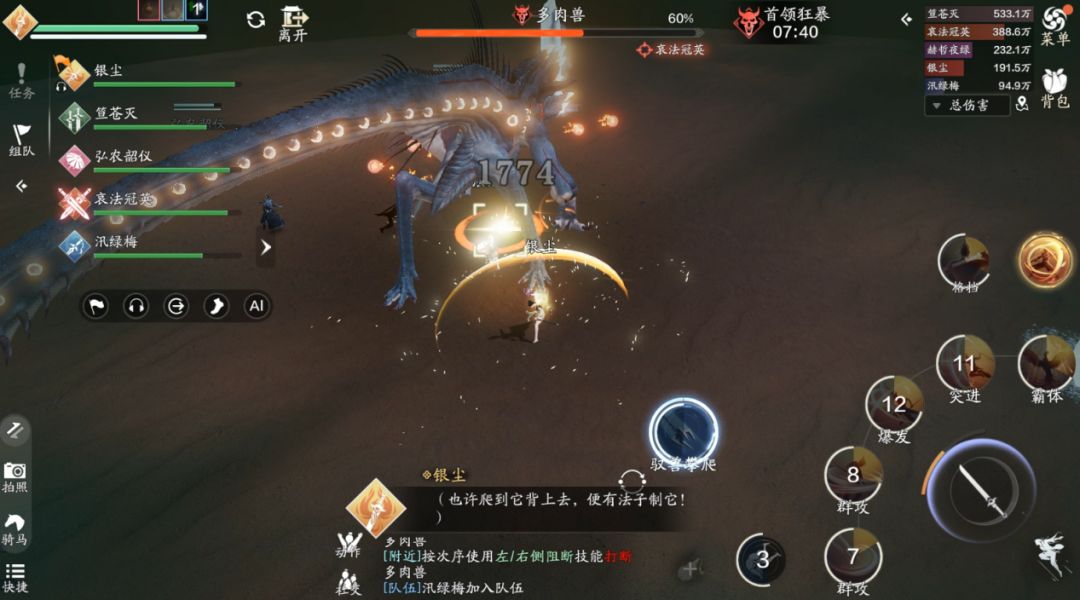 首领的定力条被清空后,少侠接近多肉兽会提示“驭兽攀爬”的图标,点击之后少侠会出现在多肉兽的背上。