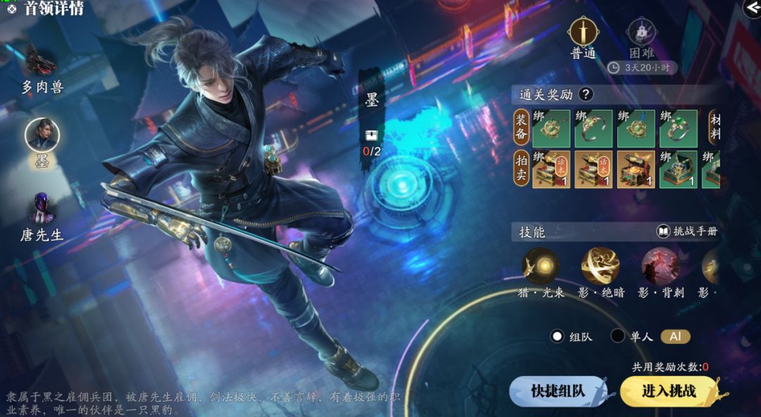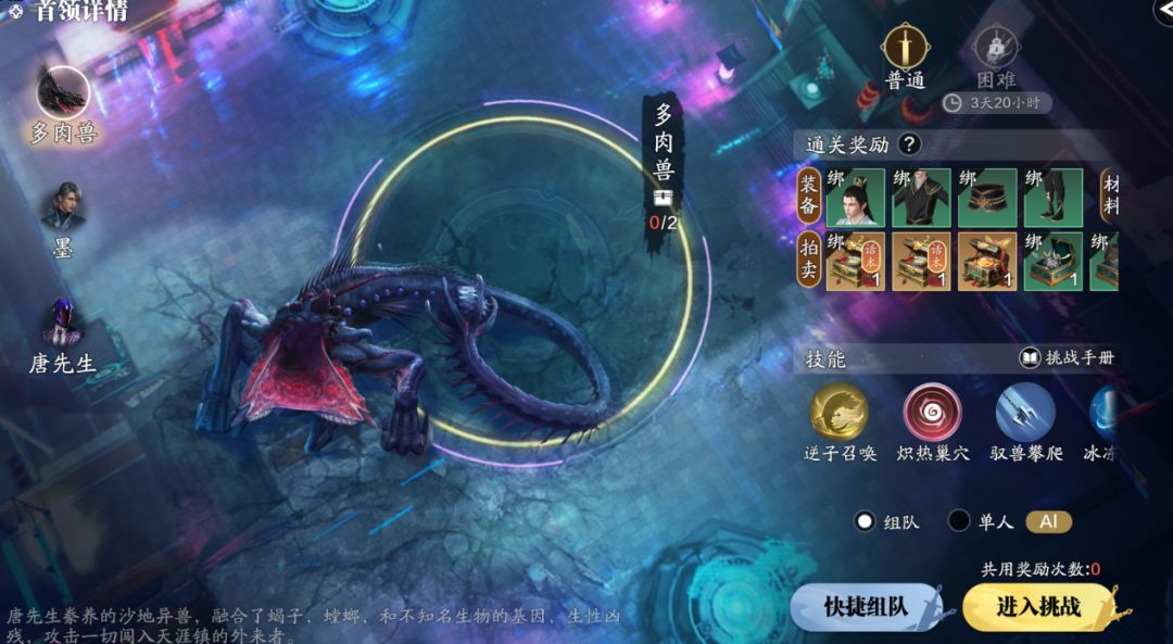 如果出现打不过的情况,可以选择单人AI,先将自己的装等进行提升,下一次再组队进行挑战。阵容搭配方面,首选1防御+1治疗+3输出的阵容,单人挑战中也可以这样,治疗职业最好选择天香,增加容错率。