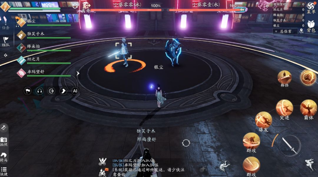 同时黑猫会释放组合技能,这个组合技能分两种情况,一种是点名三名少侠,少侠脚下会出现紫圈提示,这个技能是可以利用格挡来抵消掉的,只不过要看准释放的时机,同时要注意分散站位,以及光速的移动方向。