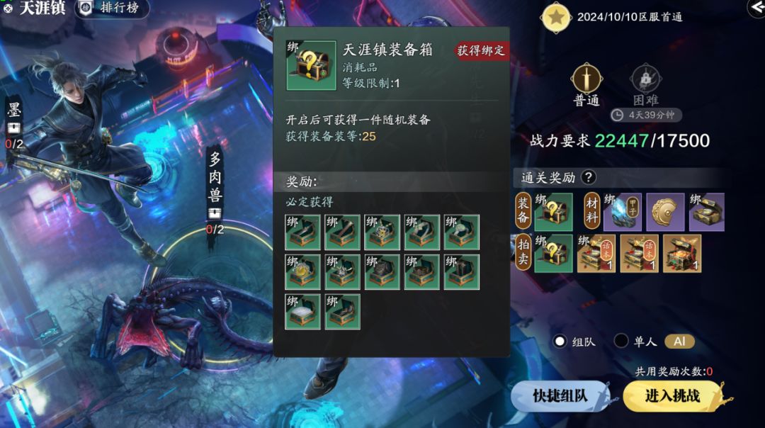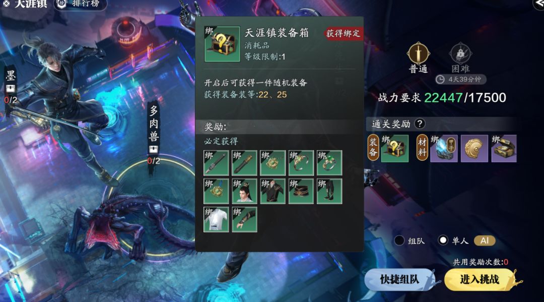 天涯镇我们可以选择组队挑战又或者单人AI挑战,组队或者单人的副本装备奖励都一样,随机获取22~25装等的装备。