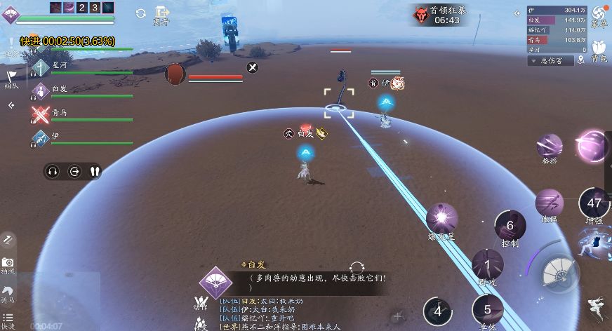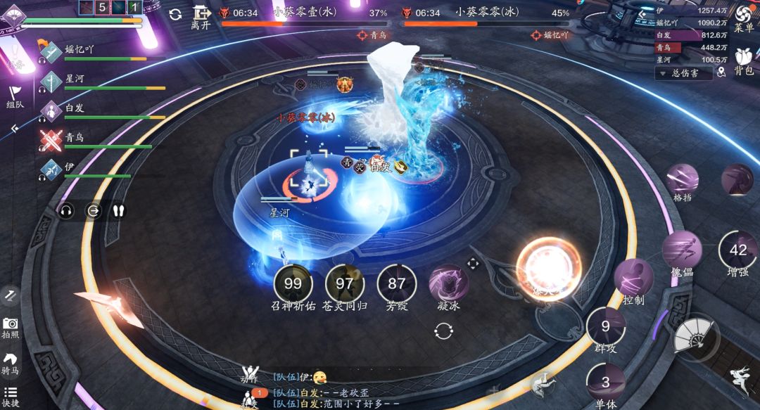 将冰柱都打掉后,首领如果在人群中释放技能,我们应当采用“同向阻断”的方法抵消它的技能,当首领双手举起释放全屏范围技能的时候,治疗的大抬要及时使用,并且万象技能的护盾也记得开启,因为这个技能无法阻断。