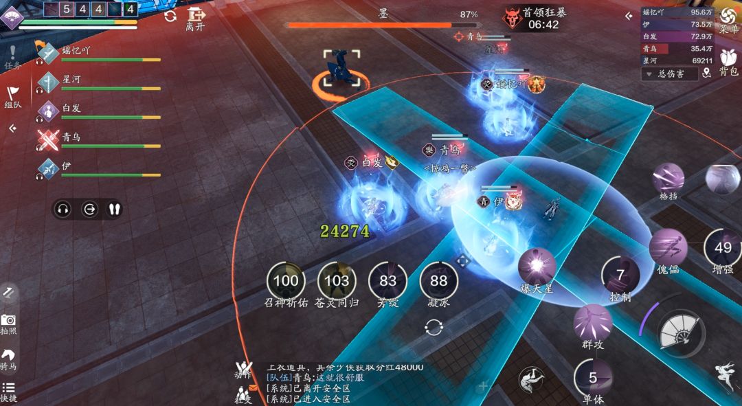 在唐先生释放完红圈技能后,所有人立即散开,根据面具的颜色技能进行躲避。同时拿盾的少侠往唐先生脚下释放水龙卷,拿剑的少侠及时将水龙卷冻住。