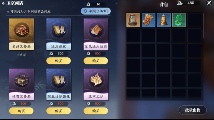 装备箱子分为金色、紫色、蓝色,可获取不同品质的装备;技能强化同样也分为3个品质,其中还分为职业技能、通用强化技能、通用技能;玉京之护则是复活次数,少侠可以按需购买。
