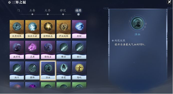 每个门派的3个基础技能都有不同的强化效果,分别为金色、紫色、蓝色、绿色,可以通过关卡奖励获取,也可以从神秘商人处购买金色的职业技能箱子获取。