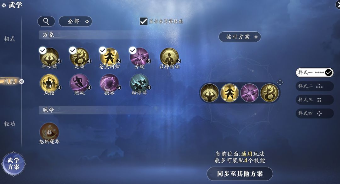 万象技能的选择我们之前也说过,它不用佩戴就可以生效,但是在话本中最多携带4个技能,建议专注输出的少侠可以携带煌威、龙战、万曜、芳绽。
